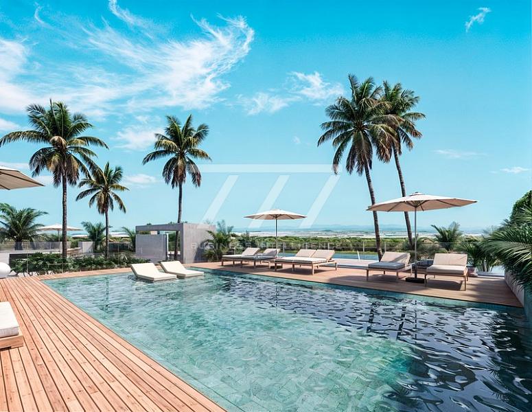 As coberturas frente mar oferecem 4 suítes (sendo uma master com banheira de imersão e vista panorâmica), sala de estar espaçosa, ambientes integrados, sacada frente mar, espaço para lareira, home office, lavabo e 4 vagas de garagem. Tudo isso com pé-direito de 3,26 m, esquadrias do piso ao teto e sistema acústico nas janelas, proporcionando uma experiência única de conforto térmico e visual.