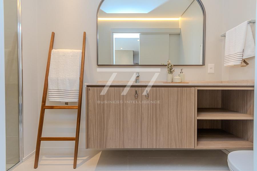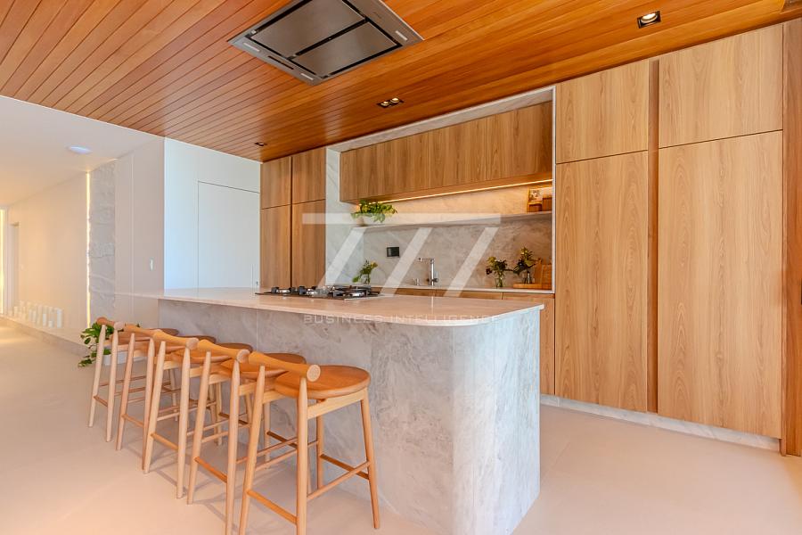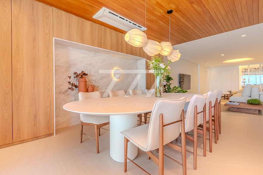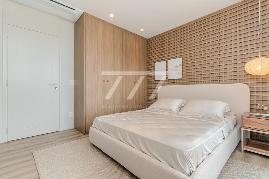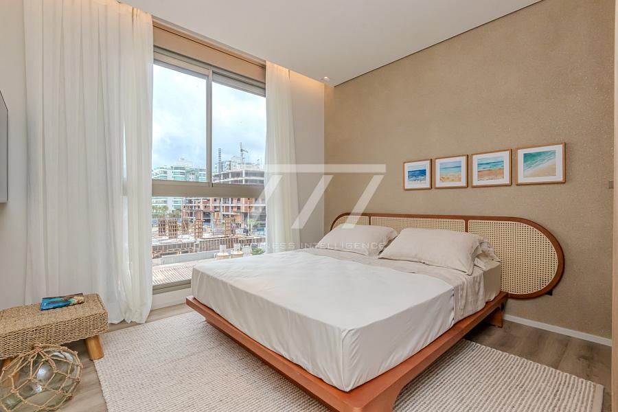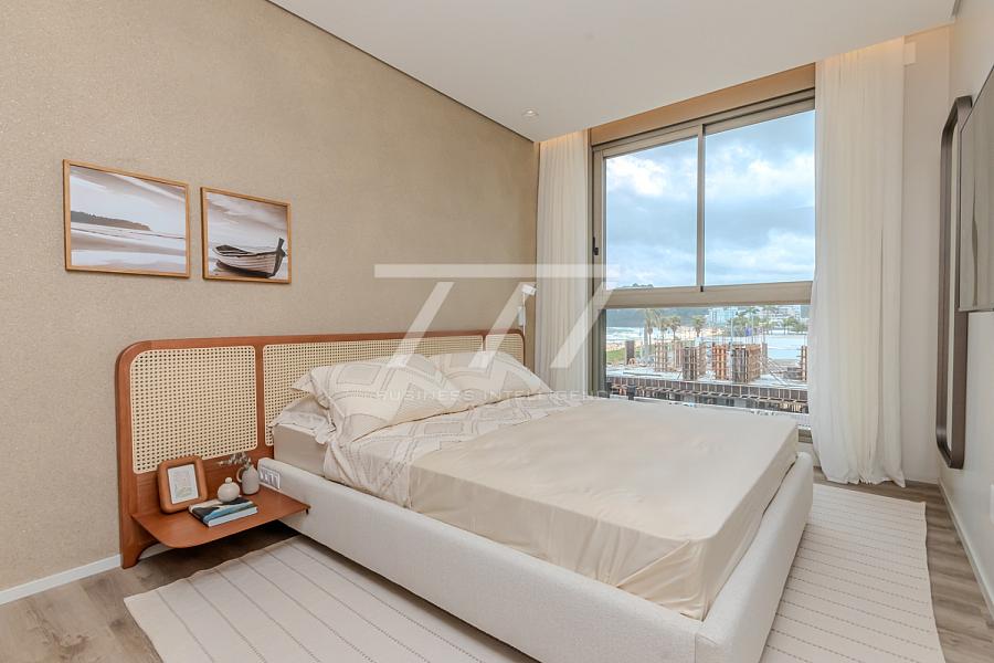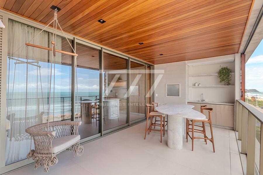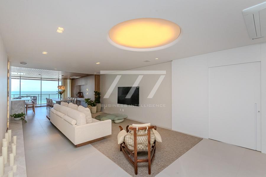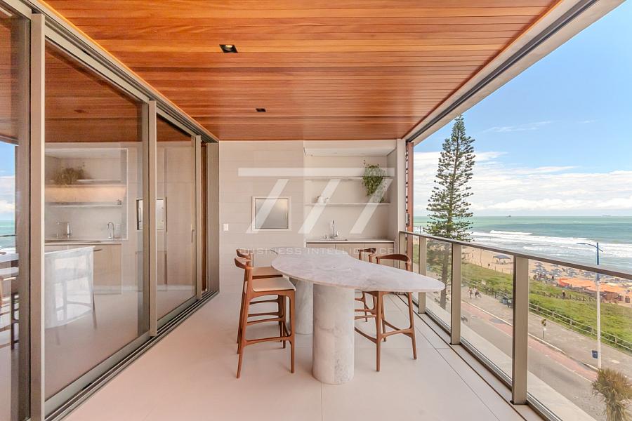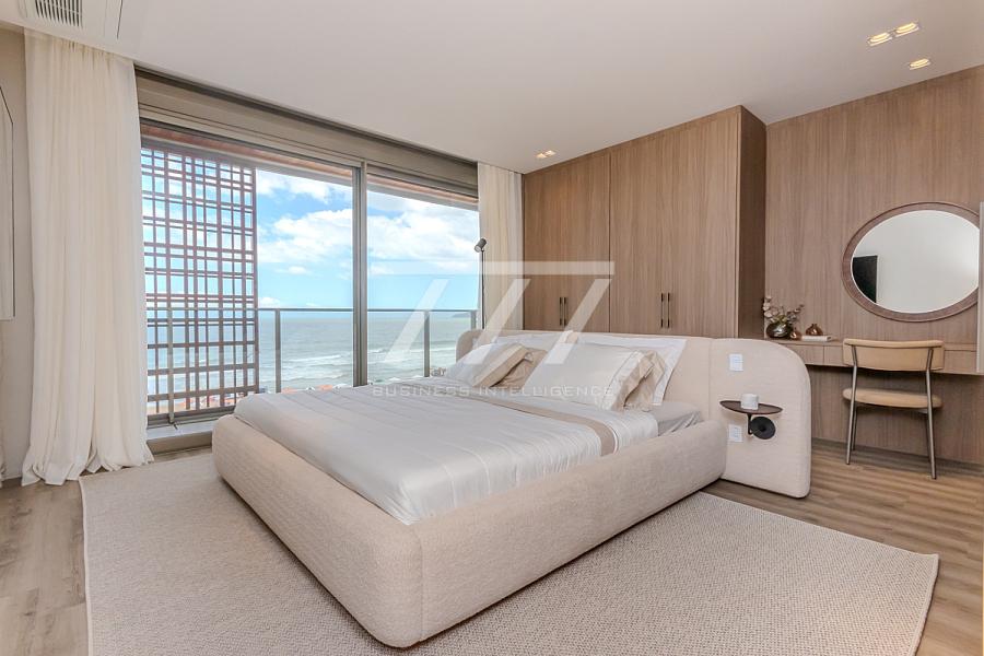 As coberturas frente mar oferecem 4 suítes (sendo uma master com banheira de imersão e vista panorâmica), sala de estar espaçosa, ambientes integrados, sacada frente mar, espaço para lareira, home office, lavabo e 4 vagas de garagem. Tudo isso com pé-direito de 3,26 m, esquadrias do piso ao teto e sistema acústico nas janelas, proporcionando uma experiência única de conforto térmico e visual.