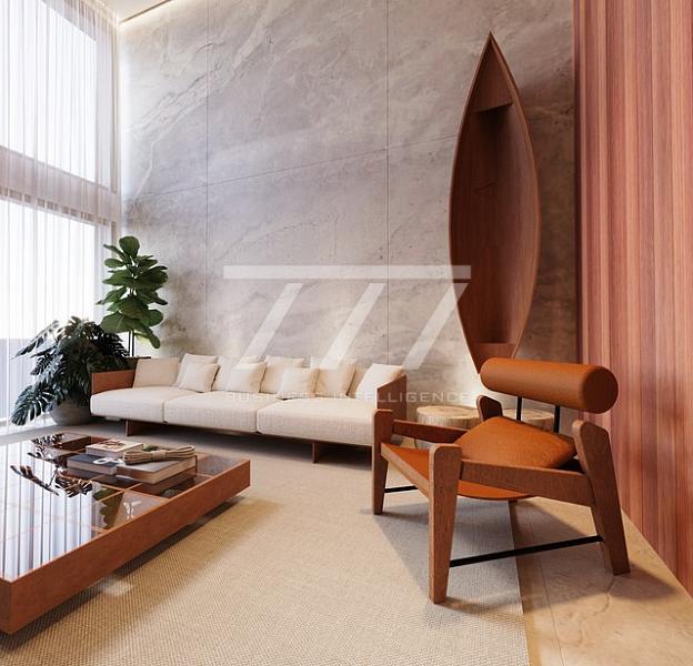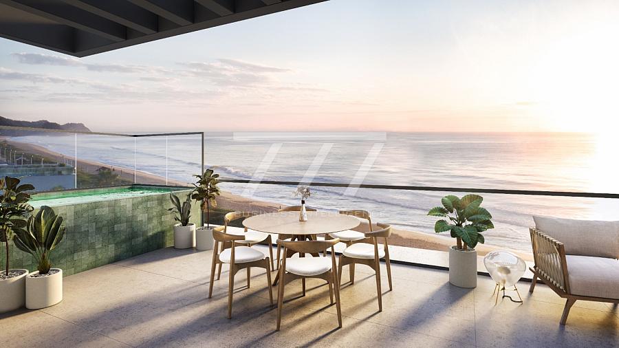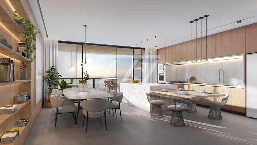As coberturas frente mar oferecem 4 suítes (sendo uma master com banheira de imersão e vista panorâmica), sala de estar espaçosa, ambientes integrados, sacada frente mar, espaço para lareira, home office, lavabo e 4 vagas de garagem. Tudo isso com pé-direito de 3,26 m, esquadrias do piso ao teto e sistema acústico nas janelas, proporcionando uma experiência única de conforto térmico e visual.